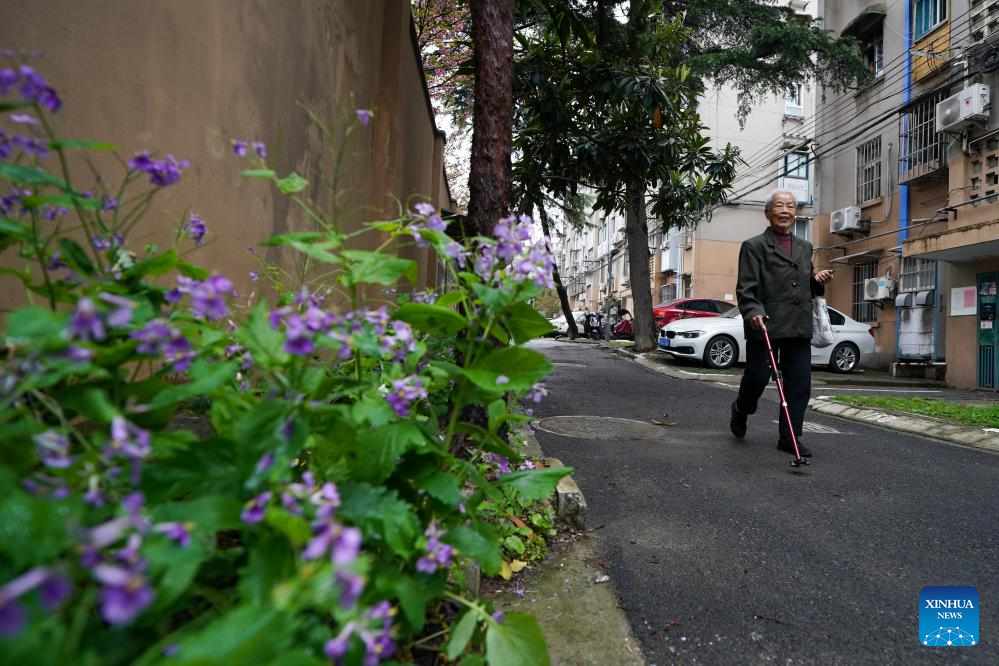 Ai Yiying, a Nanjing Massacre survivor, walks in the community where she lives in Nanjing, east China's Jiangsu Province, April 3, 2024.(Xinhua/Li Bo)