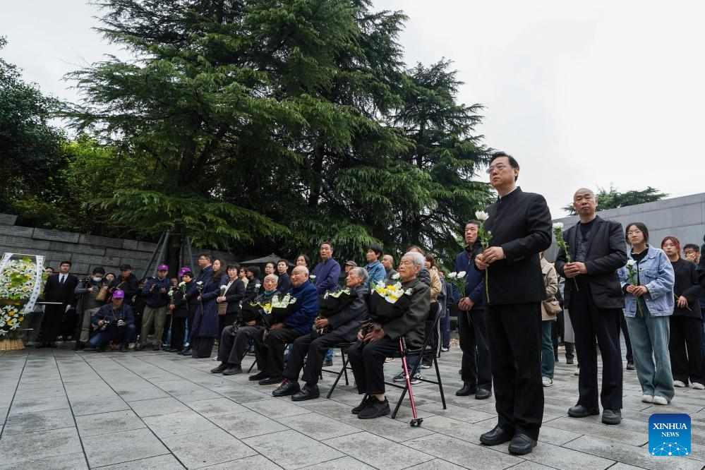 This photo taken on April 3, 2024 shows Ai Yiying (2nd R, front), a Nanjing Massacre survivor, attending a commemoration ceremony at the Memorial Hall of the Victims in Nanjing Massacre by Japanese Invaders, in Nanjing, east China's Jiangsu Province, on the Qingming Festival, or the Tomb-Sweeping Day, a traditional Chinese festival during which people pay tribute to the dead and worship their ancestors. (Xinhua/Li Bo)
