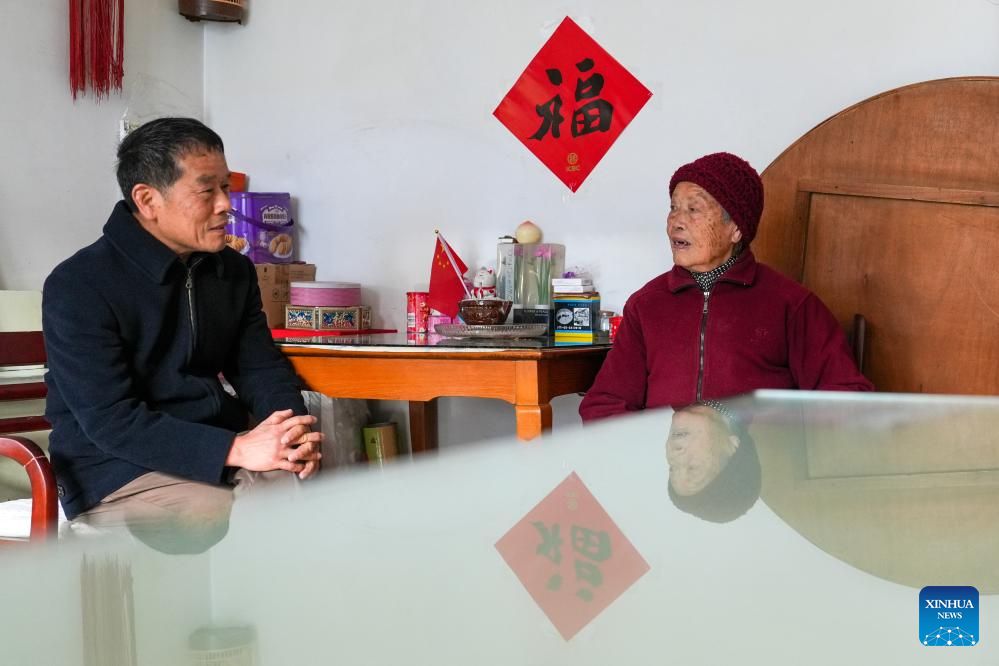 Ai Yiying (R), a Nanjing Massacre survivor, talks with her son Huang Xinghua at home in Nanjing, east China's Jiangsu Province, Dec. 7, 2024. (Xinhua/Li Bo)