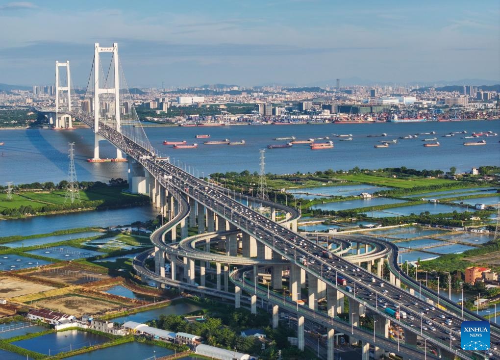An aerial drone photo taken on Oct. 2, 2024 shows a view of the Nansha Bridge, which links Guangzhou City and Dongguan City, and ships along the Shiziyang channel in the Pearl River Estuary area, in south China's Guangdong Province. In recent years, the construction of cross-river and cross-sea passages in the Guangdong-Hong Kong-Macao Greater Bay Area has developed rapidly. The passage networks play a significant role in building and improving the comprehensive three-dimensional transportation network in the Greater Bay Area, as well as promoting deeper integration and development in the region. (Xinhua/Liu Dawei)