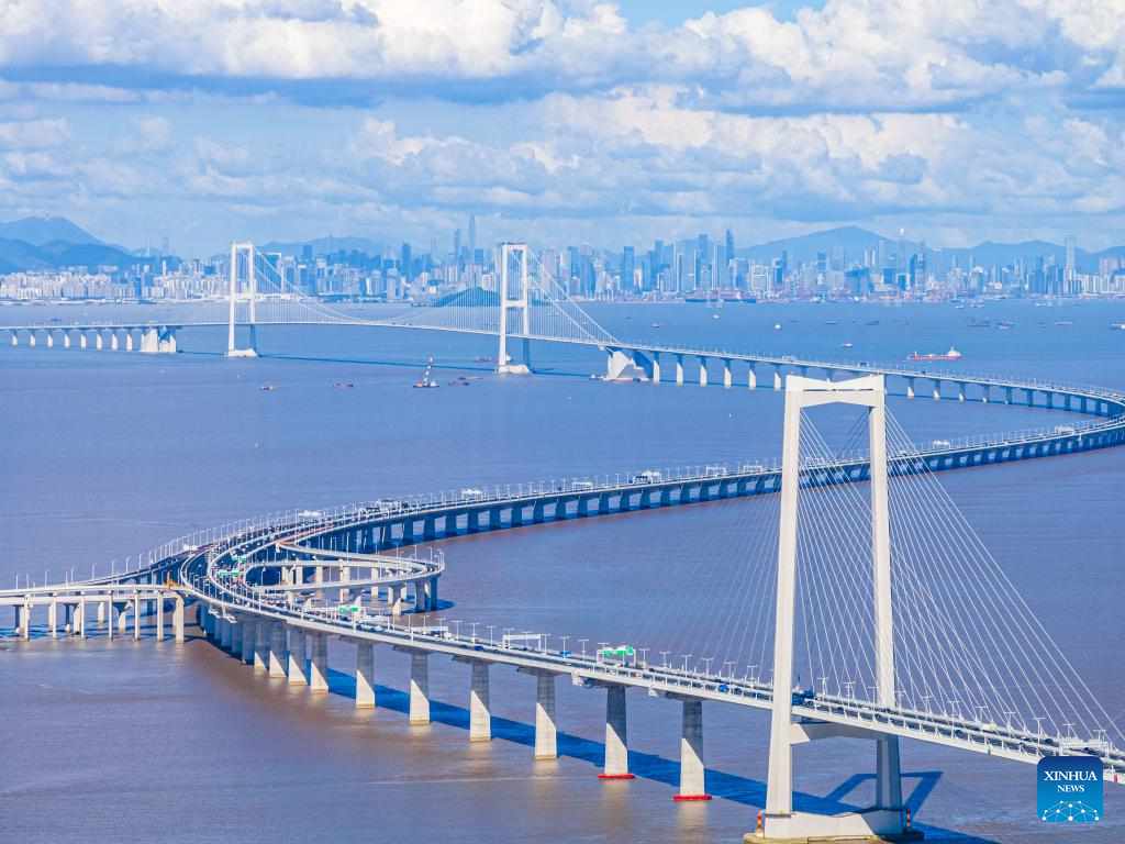 This photo taken on Dec. 7, 2024 shows a view of Gaolan Port Bridge (with twin main towers on the left) and Huangmao Sea Channel Bridge (with three main towers on the right) in south China's Guangdong Province. In recent years, the construction of cross-river and cross-sea passages in the Guangdong-Hong Kong-Macao Greater Bay Area has developed rapidly. The passage networks play a significant role in building and improving the comprehensive three-dimensional transportation network in the Greater Bay Area, as well as promoting deeper integration and development in the region. (Xinhua/Liu Dawei)