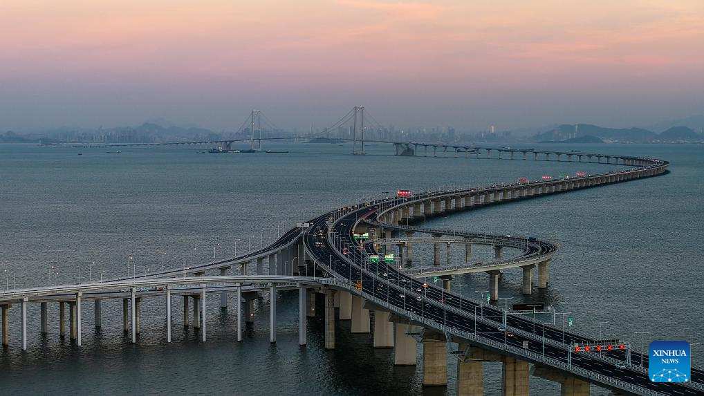 An aerial drone photo taken on Nov. 24, 2024 shows athletes participating in a cycling race passing through the Hong Kong-Zhuhai-Macao Bridge in south China. In recent years, the construction of cross-river and cross-sea passages in the Guangdong-Hong Kong-Macao Greater Bay Area has developed rapidly. The passage networks play a significant role in building and improving the comprehensive three-dimensional transportation network in the Greater Bay Area, as well as promoting deeper integration and development in the region. (Xinhua/Liu Dawei)