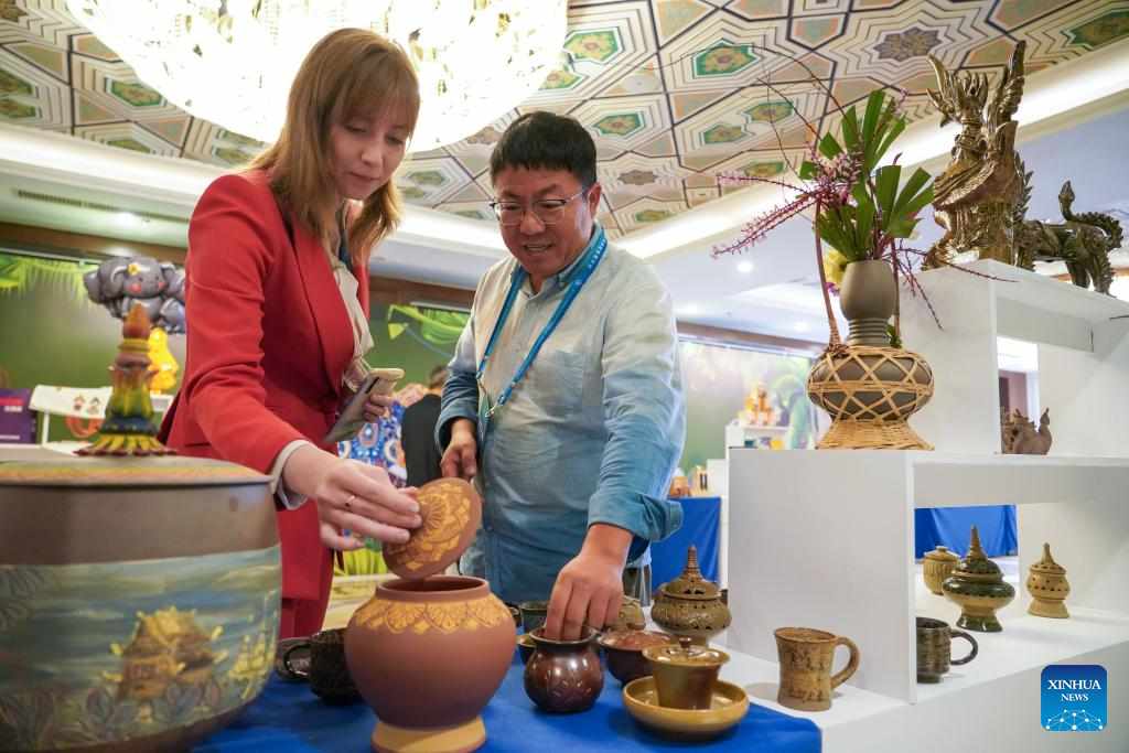 A participant (L) attending the 3rd Yunnan International Communication Forum learns about pottery product of Dai ethnic group in Xishuangbanna, southwest China's Yunnan Province, Dec. 10, 2024. The 3rd Yunnan International Communication Forum opened here on Tuesday. More than 200 scholars, officials and media representatives from 21 countries attended the forum. (Xinhua/Wang Jingyi)