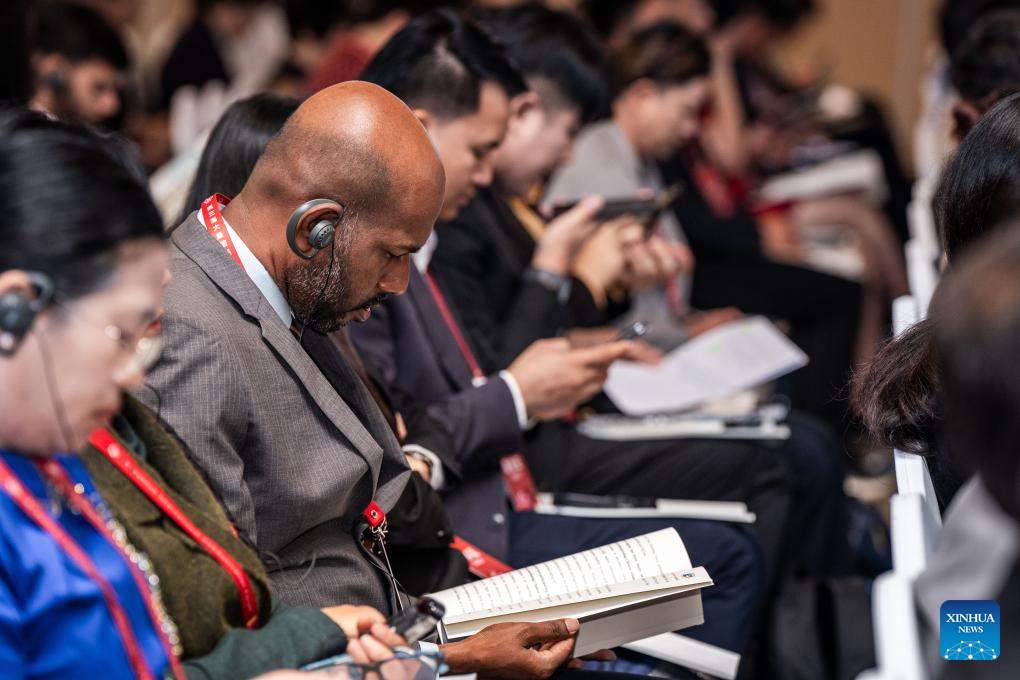 Participants attend a panel discussion during the 3rd Yunnan International Communication Forum in Xishuangbanna, southwest China's Yunnan Province, Dec. 10, 2024. The 3rd Yunnan International Communication Forum opened here on Tuesday. More than 200 scholars, officials and media representatives from 21 countries attended the forum. (Xinhua/Meng Tao)