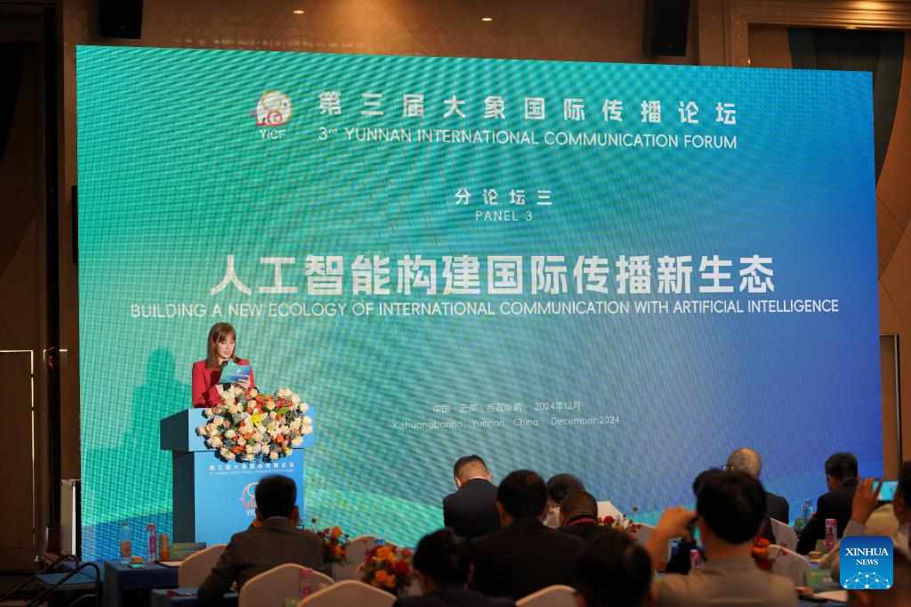 Participants speak on the main forum of the 3rd Yunnan International Communication Forum in Xishuangbanna, southwest China's Yunnan Province, Dec. 10, 2024. The 3rd Yunnan International Communication Forum opened here on Tuesday. More than 200 scholars, officials and media representatives from 21 countries attended the forum. (Xinhua/Xin Yuewei)