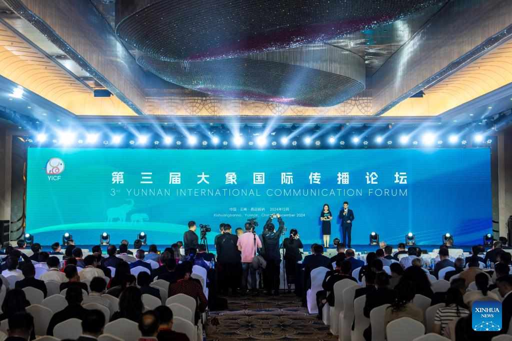 The opening ceremony of the 3rd Yunnan International Communication Forum is held in Xishuangbanna, southwest China's Yunnan Province, Dec. 10, 2024. The 3rd Yunnan International Communication Forum opened here on Tuesday. More than 200 scholars, officials and media representatives from 21 countries attended the forum. (Xinhua/Hu Chao)