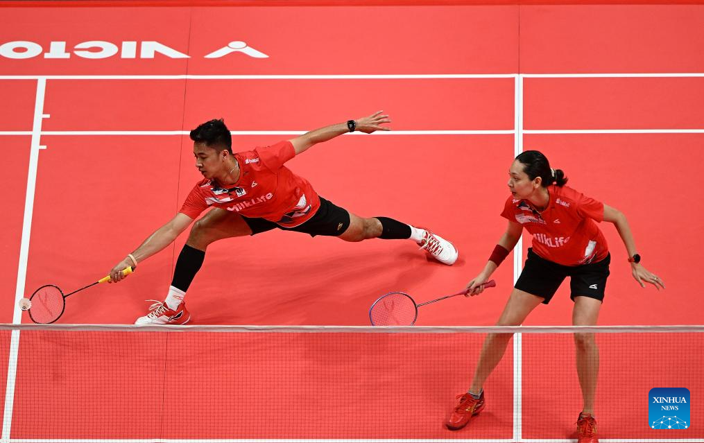 Dejan Ferdinansyah (L)/Gloria Emanuelle Widjaja compete during the mixed doubles Group B match between Dejan Ferdinansyah/Gloria Emanuelle Widjaja of Indonesia and Midorikawa Hiroki/Saito Natsu of Japan at the BWF World Tour Finals 2024 in Hangzhou, China, Dec. 11, 2024. (Xinhua/Hou Zhaokang)