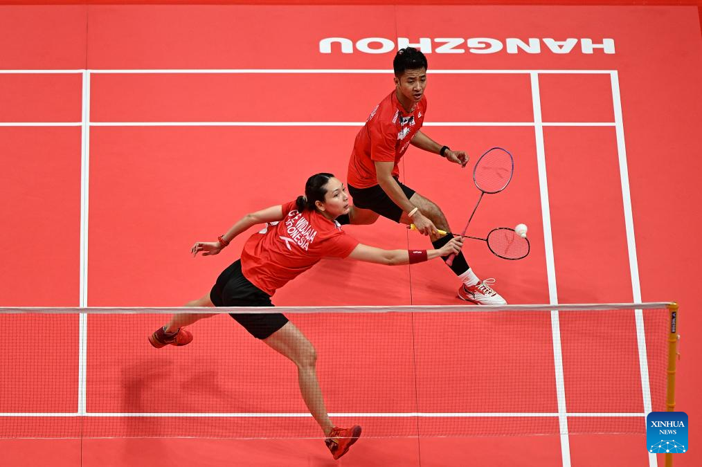 Dejan Ferdinansyah /Gloria Emanuelle Widjaja (L) celebrate scoring during the mixed doubles Group B match between Dejan Ferdinansyah/Gloria Emanuelle Widjaja of Indonesia and Midorikawa Hiroki/Saito Natsu of Japan at the BWF World Tour Finals 2024 in Hangzhou, China, Dec. 11, 2024. (Xinhua/Hou Zhaokang)