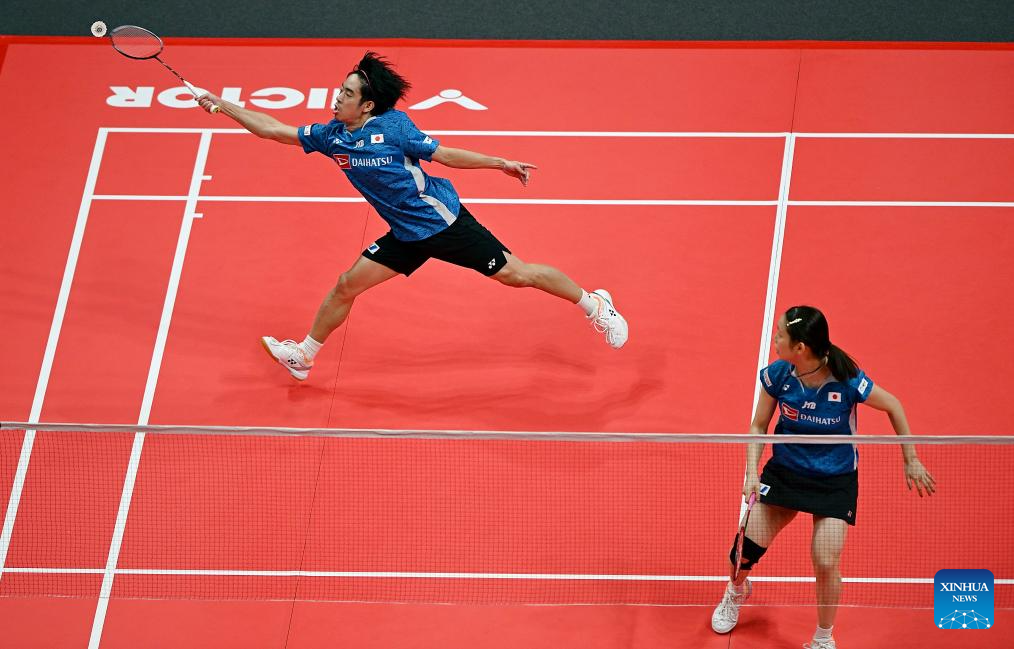 Midorikawa Hiroki (L)/Saito Natsu compete during the mixed doubles Group B match between Dejan Ferdinansyah/Gloria Emanuelle Widjaja of Indonesia and Midorikawa Hiroki/Saito Natsu of Japan at the BWF World Tour Finals 2024 in Hangzhou, China, Dec. 11, 2024. (Xinhua/Hou Zhaokang)