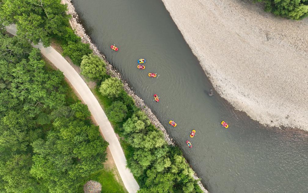 An aerial drone photo taken on July 6, 2024 shows tourists drifting on a lake in Zhalantun City, north China's Inner Mongolia Autonomous Region. (Xinhua/Bei He)