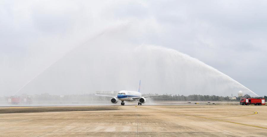 A C919 aircraft operated by China Southern Airlines taxis through the water salute after landing at Haikou Meilan International Airport in Haikou, south China's Hainan Province, on Dec. 11, 2024. (Xinhua/Yang Guanyu)