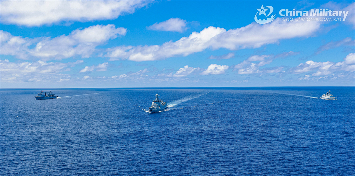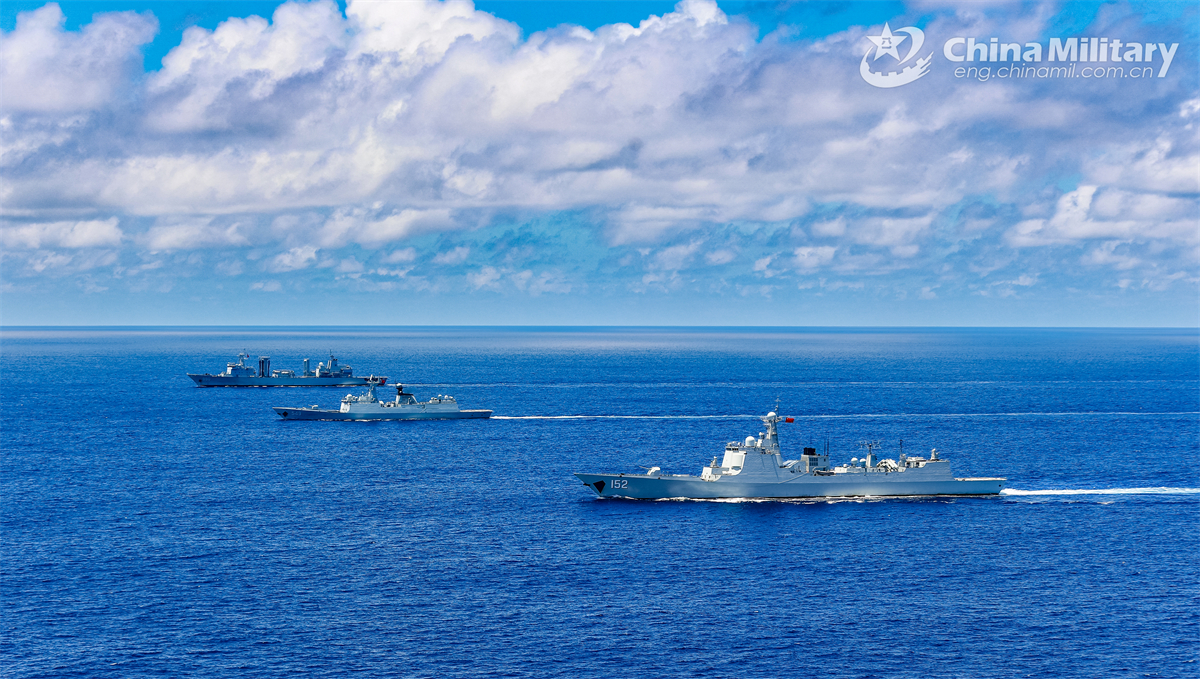 Guided-missile destroyer Ji'nan (Hull 152), guided-missile frigate Changzhou (Hull 549) and comprehensive supply ship Chaohu (Hull 890) attached to a naval detachment of the Chinese People's Liberation Army (PLA) sail in formation during a maritime training exercise on November 8, 2024. (eng.chinamil.com.cn/Photo by Xu Chongkang)