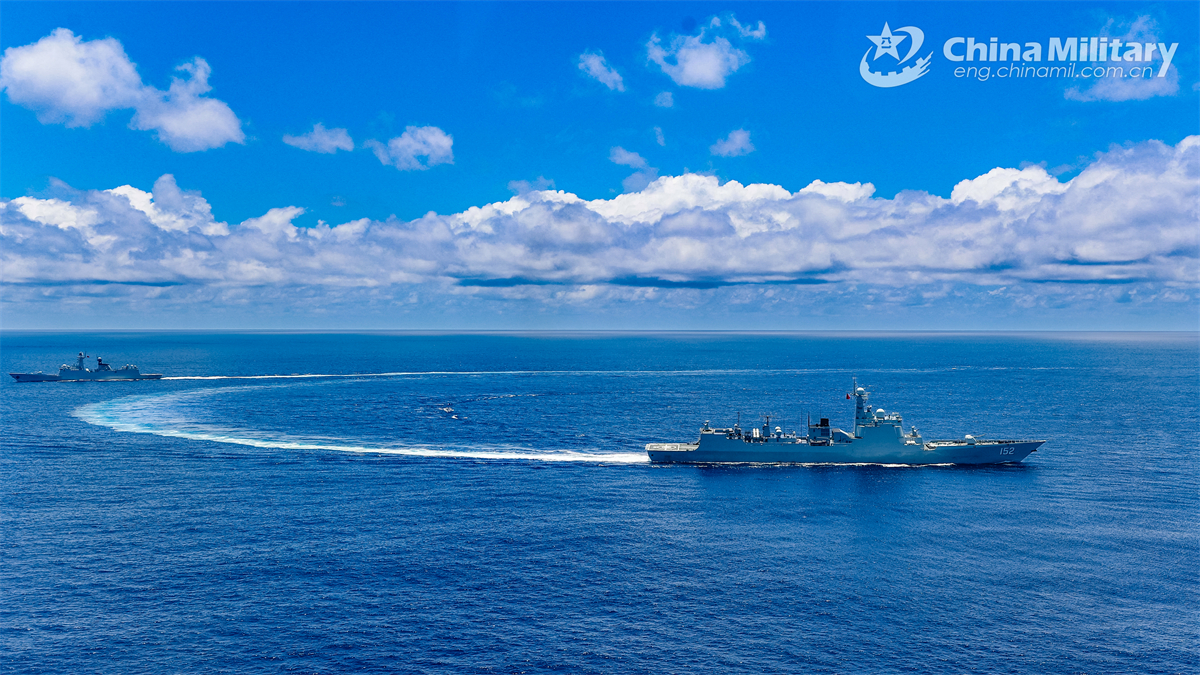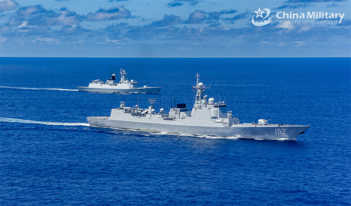 Guided-missile destroyer Ji'nan (Hull 152) and guided-missile frigate Changzhou (Hull 549) attached to a naval detachment of the Chinese People's Liberation Army (PLA) sail in formation during a maritime training exercise on November 8, 2024. (eng.chinamil.com.cn/Photo by Xu Chongkang)