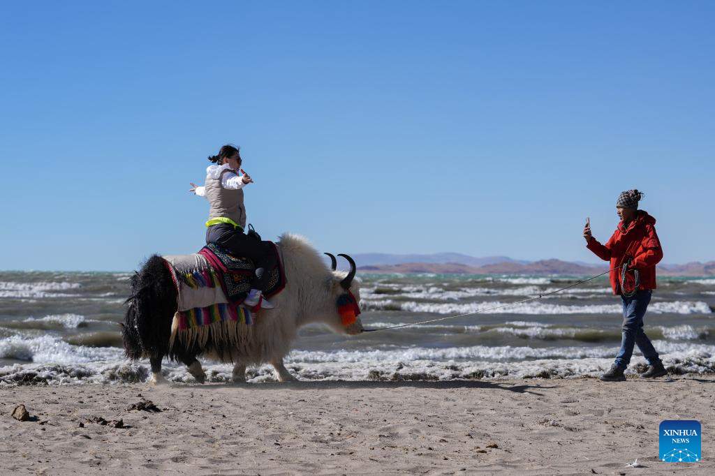 A tourist poses for photos by Namtso Lake in southwest China's Xizang Autonomous Region, Dec. 11, 2024. (Xinhua/Ding Ting)
