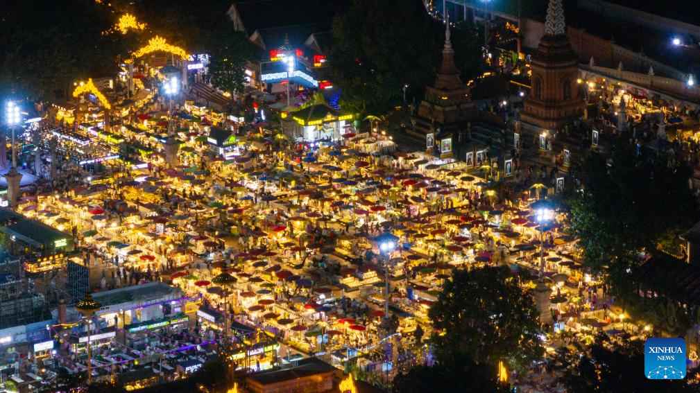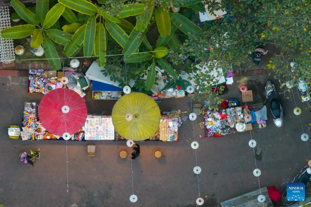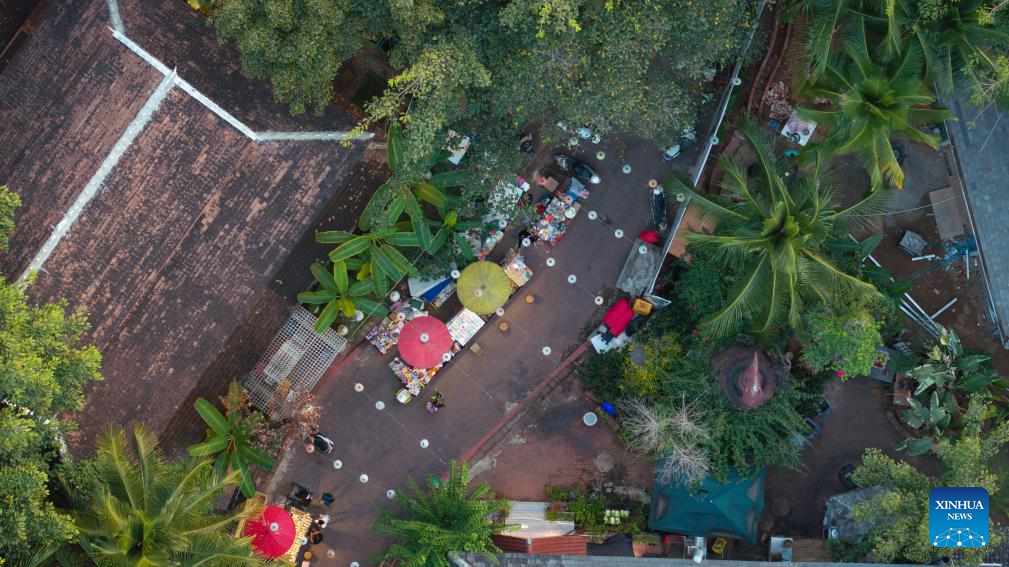 An aerial drone photo taken on Dec. 11, 2024 shows a view of the Starlight Night Market in Jinghong City in Xishuangbanna Dai Autonomous Prefecture, southwest China's Yunnan Province. (Xinhua/Meng Tao)