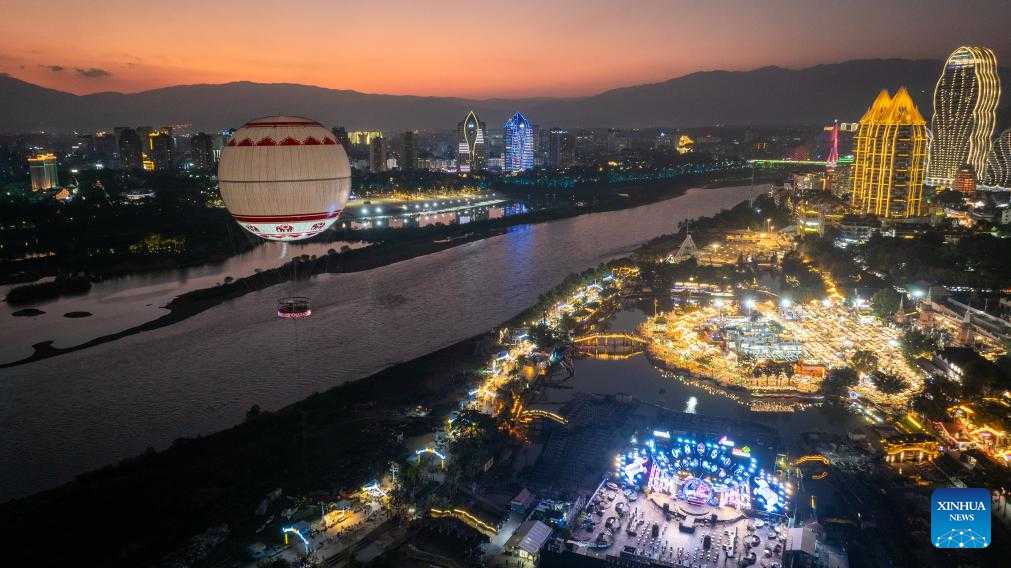 An aerial drone photo taken on Dec. 11, 2024 shows a night view of Jinghong City in Xishuangbanna Dai Autonomous Prefecture, southwest China's Yunnan Province. (Xinhua/Meng Tao)
