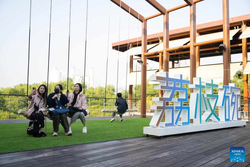 People take selfies at the revitalized Lai Chi Vun Shipyards in south China's Macao Special Administrative Region (SAR), Dec. 7, 2024. The Macao SAR government has been committed to revitalizing and utilizing the historic areas in the region. An increasing number of locals and tourists visit these areas today to feel the charm of integration between traditional and modern cultures. (Xinhua/Cheong Kam Ka)