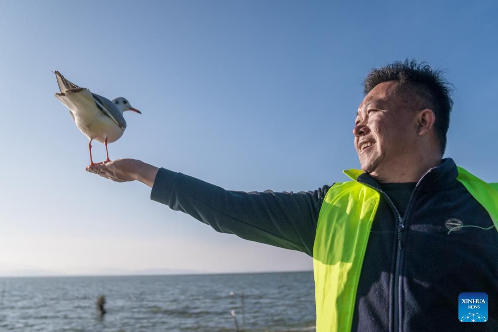 Zhang Liyun looks at a black-headed gull perching on his right hand at the Wangguan wetland park by the Dianchi Lake in Kunming, southwest China's Yunnan Province, Dec. 11, 2024. Kunming is a wintering destination for black-headed gulls which migrate to the city every year by tens of thousands. A decade ago, local resident Zhang Liyun started feeding the gulls staying by the Dianchi Lake as a volunteer, an undertaking to which he has been committed till this day. During the wintering season, he arrives at the Wangguan wetland park with specially prepared fodder at around seven o'clock every morning. Meanwhile, Zhang keeps posting videos of feeding the gulls on social media in a bid to raise public awareness of the bird species' protection. (Photo by Peng Yikai/Xinhua)