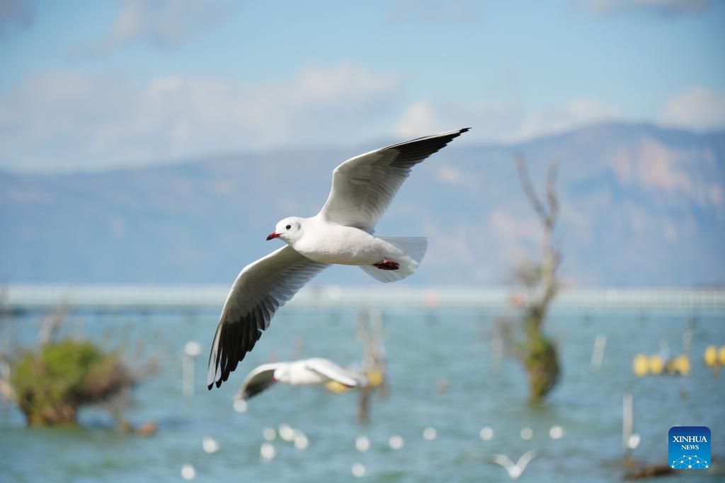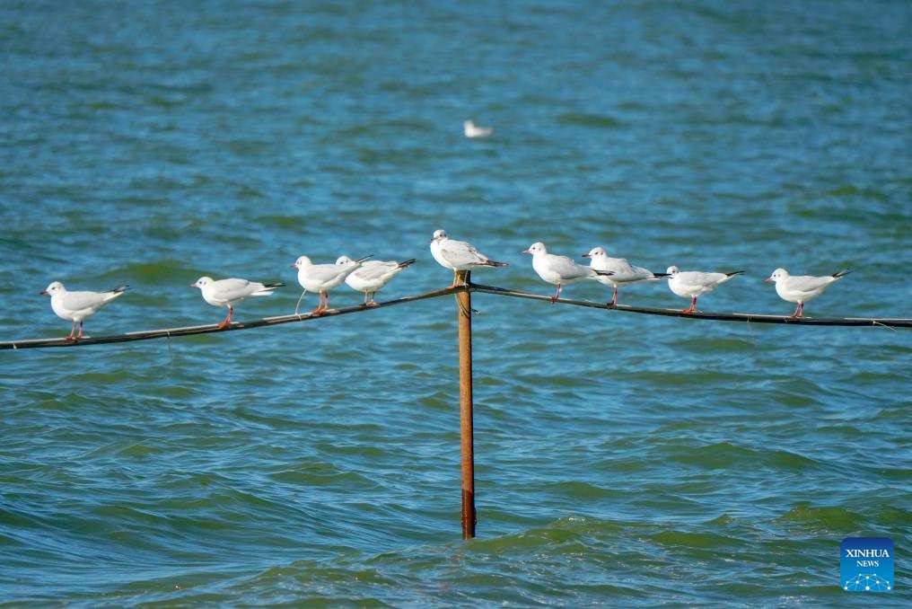 Black-headed gulls are pictured at the Wangguan wetland park by the Dianchi Lake in Kunming, southwest China's Yunnan Province, Dec. 9, 2024. Kunming is a wintering destination for black-headed gulls which migrate to the city every year by tens of thousands. A decade ago, local resident Zhang Liyun started feeding the gulls staying by the Dianchi Lake as a volunteer, an undertaking to which he has been committed till this day. During the wintering season, he arrives at the Wangguan wetland park with specially prepared fodder at around seven o'clock every morning. Meanwhile, Zhang keeps posting videos of feeding the gulls on social media in a bid to raise public awareness of the bird species' protection. (Xinhua/Gao Yongwei)