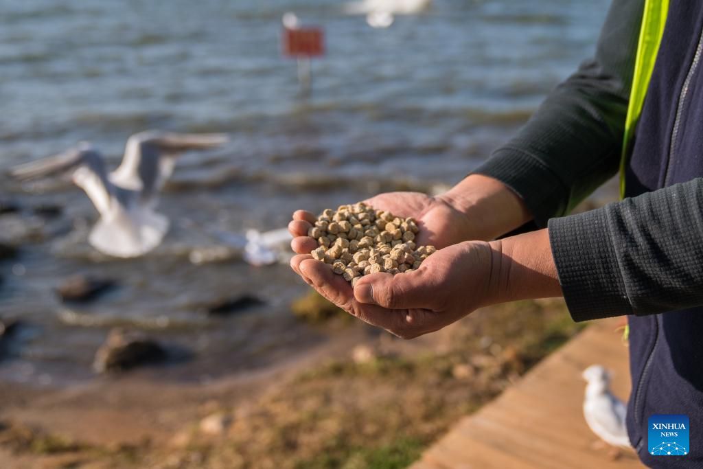 Zhang Liyun shows specially prepared fodder for black-headed gulls at the Wangguan wetland park by the Dianchi Lake in Kunming, southwest China's Yunnan Province, Dec. 11, 2024. Kunming is a wintering destination for black-headed gulls which migrate to the city every year by tens of thousands. A decade ago, local resident Zhang Liyun started feeding the gulls staying by the Dianchi Lake as a volunteer, an undertaking to which he has been committed till this day. During the wintering season, he arrives at the Wangguan wetland park with specially prepared fodder at around seven o'clock every morning. Meanwhile, Zhang keeps posting videos of feeding the gulls on social media in a bid to raise public awareness of the bird species' protection. (Photo by Peng Yikai/Xinhua)