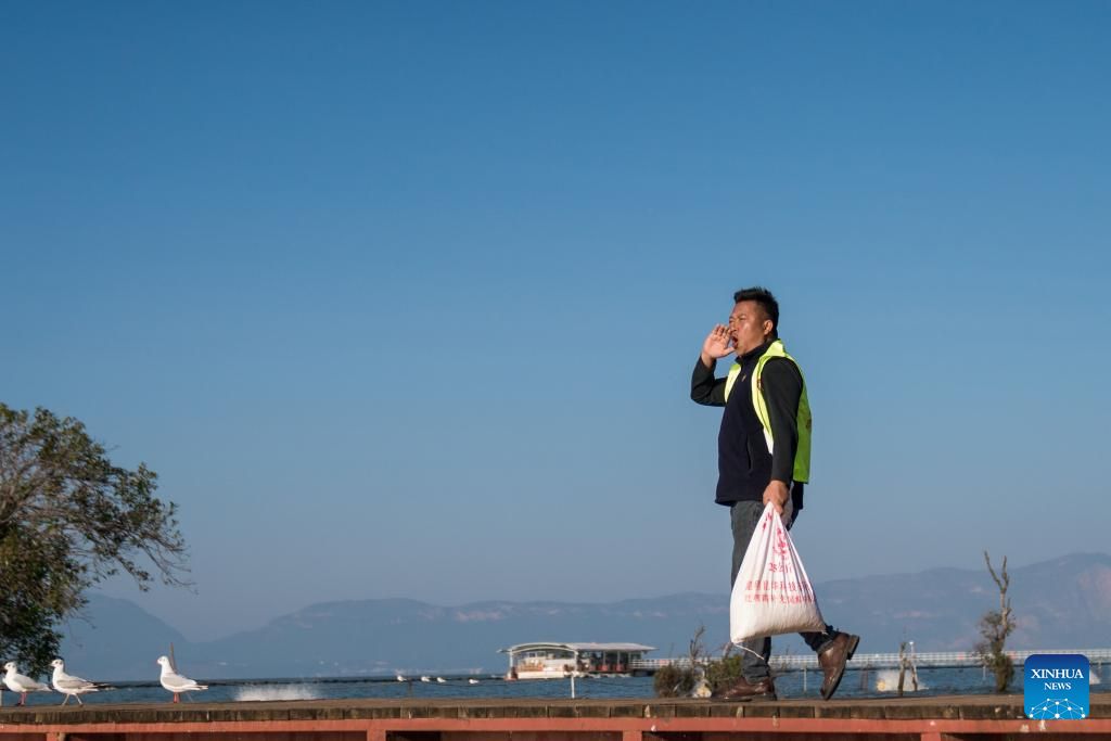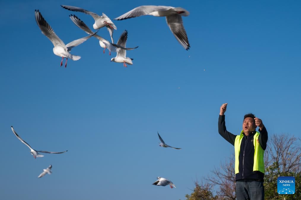 Pic story: volunteer dedicated to feeding gulls by Dianchi Lake in Kunming