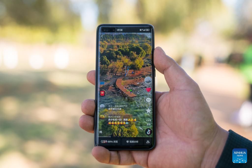 Zhang Liyun shows his Douyin account where he shares videos of feeding black-headed gulls at the Wangguan wetland park by the Dianchi Lake in Kunming, southwest China's Yunnan Province, Dec. 11, 2024. Kunming is a wintering destination for black-headed gulls which migrate to the city every year by tens of thousands. A decade ago, local resident Zhang Liyun started feeding the gulls staying by the Dianchi Lake as a volunteer, an undertaking to which he has been committed till this day. During the wintering season, he arrives at the Wangguan wetland park with specially prepared fodder at around seven o'clock every morning. Meanwhile, Zhang keeps posting videos of feeding the gulls on social media in a bid to raise public awareness of the bird species' protection. (Photo by Peng Yikai/Xinhua)
