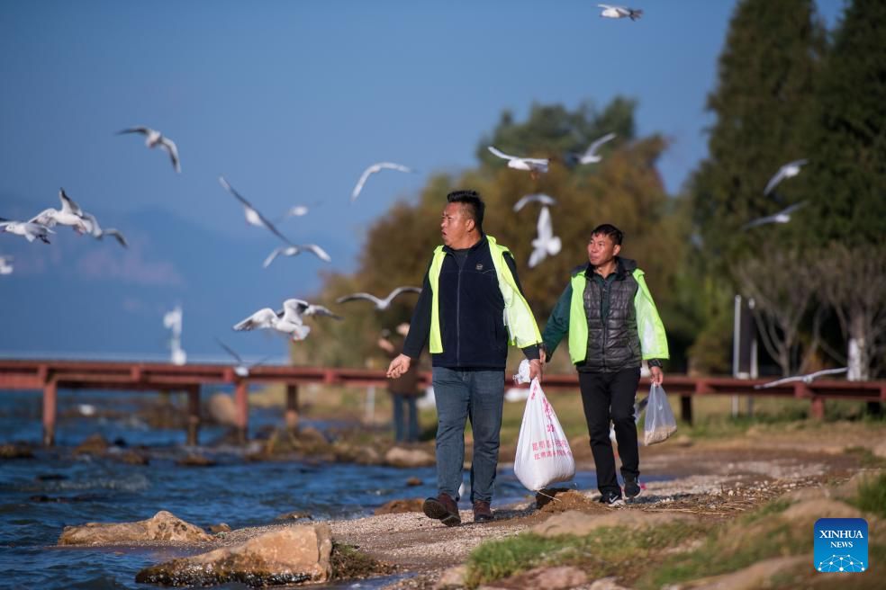 Zhang Liyun (front) prepares to feed black-headed gulls at the Wangguan wetland park by the Dianchi Lake in Kunming, southwest China's Yunnan Province, Dec. 11, 2024. Kunming is a wintering destination for black-headed gulls which migrate to the city every year by tens of thousands. A decade ago, local resident Zhang Liyun started feeding the gulls staying by the Dianchi Lake as a volunteer, an undertaking to which he has been committed till this day. During the wintering season, he arrives at the Wangguan wetland park with specially prepared fodder at around seven o'clock every morning. Meanwhile, Zhang keeps posting videos of feeding the gulls on social media in a bid to raise public awareness of the bird species' protection. (Photo by Peng Yikai/Xinhua)