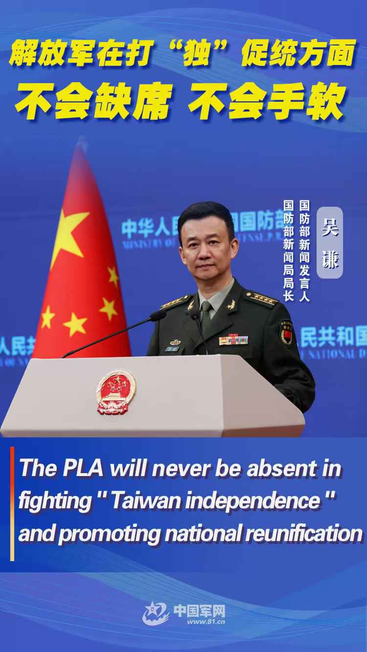 Wu Qian: It is the PLA's lofty mission to protect national sovereignty and territorial integrity, safeguard the fundamental interests of the Chinese nation, and defend the shared interests of compatriots on both sides of the Strait. As water has no constant form, there are in warfare no constant conditions. The PLA will decide whether and when to conduct military exercises in accordance with our needs and the situation on the ground. Whether there is a military exercise or not, the PLA will never be absent in fighting "Taiwan independence" and promoting national reunification. Any attempt to split the nation through soliciting external support or resorting to force will be punished, and will never succeed.