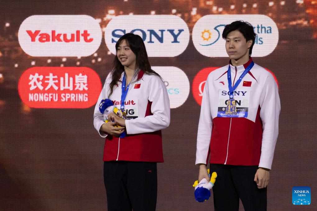 Gold medalists Tang Qianting (L) of China and Qin Haiyang of China pose during the awarding ceremony of women's and men's 100m breaststroke at the World Aquatics Swimming Championships (25m) in Budapest, Hungary, Dec. 12, 2024. (Photo by Attila Volgyi/Xinhua)