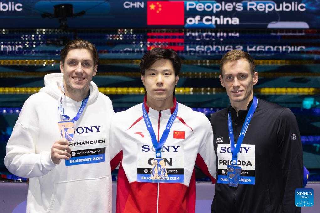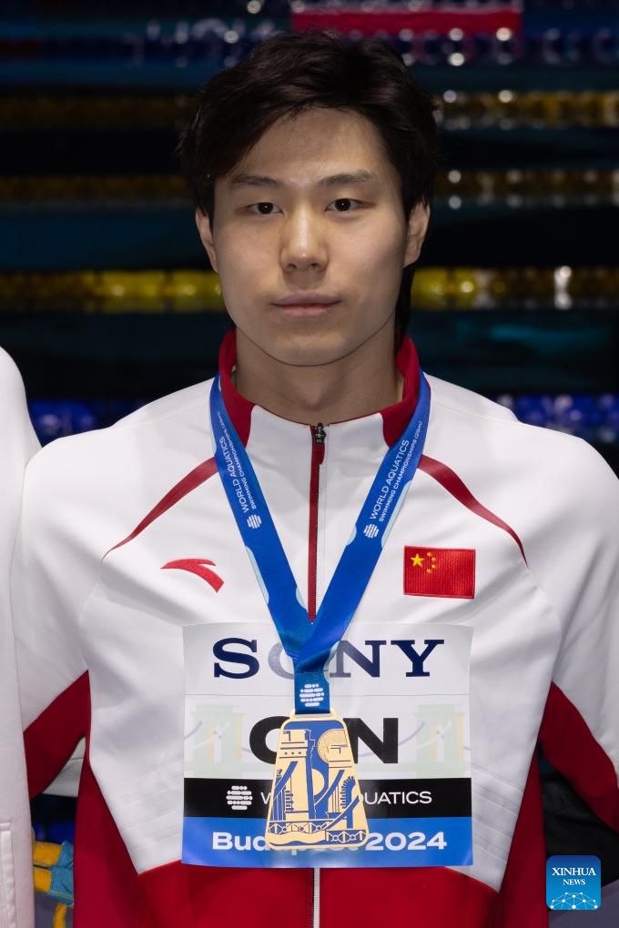 Gold medalist Qin Haiyang of China poses at the awarding ceremony of men's 100m breaststroke at the World Aquatics Swimming Championships (25m) in Budapest, Hungary, Dec. 12, 2024. (Photo by Attila Volgyi/Xinhua)
