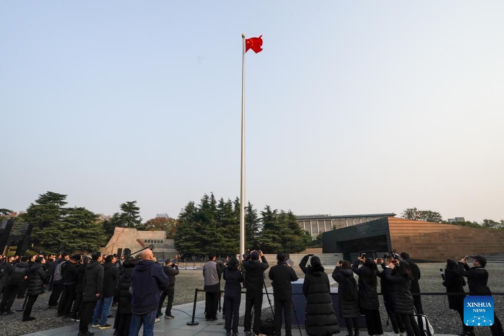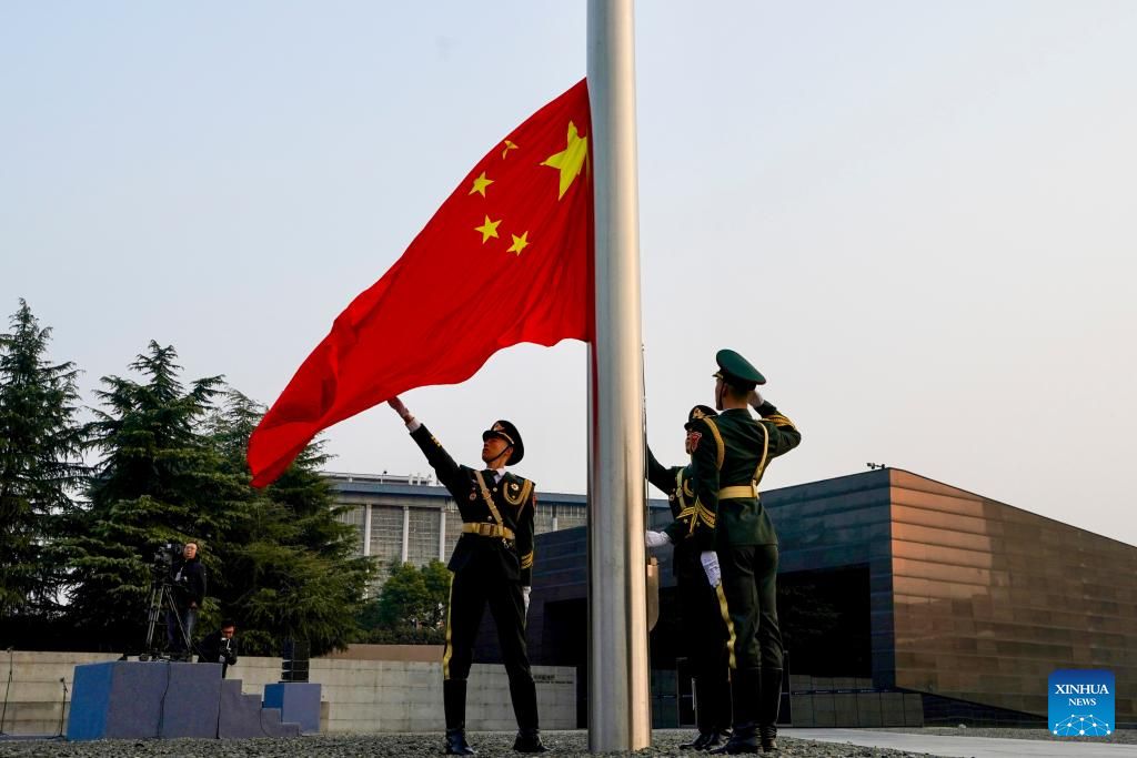 A flag-raising ceremony is held at the Memorial Hall of the Victims in Nanjing Massacre by Japanese Invaders in Nanjing, capital of east China's Jiangsu Province, Dec. 13, 2024. Friday marks the 11th national memorial ceremony for the Nanjing Massacre victims. (Xinhua/Li Bo)