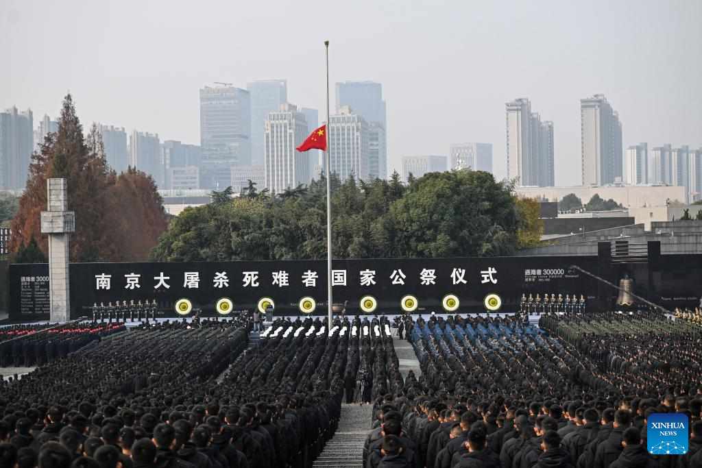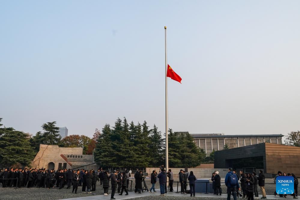 A flag-raising ceremony and a ceremony to lower the China's national flag at half mast are held at the Memorial Hall of the Victims in Nanjing Massacre by Japanese Invaders in Nanjing, capital of east China's Jiangsu Province, Dec. 13, 2024. Friday marks the 11th national memorial ceremony for the Nanjing Massacre victims. (Xinhua/Li Bo)
