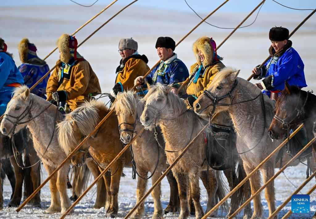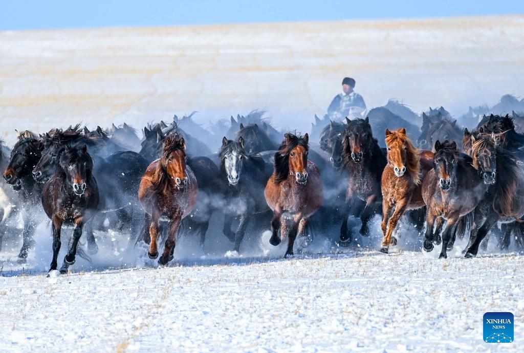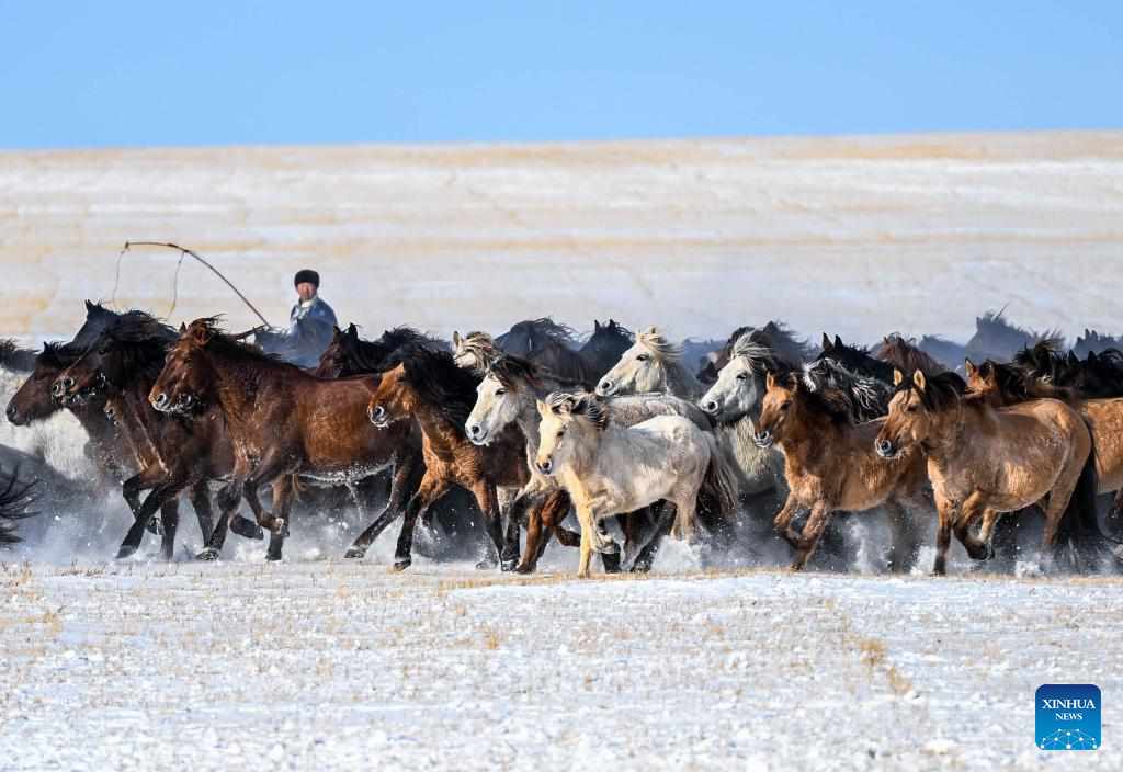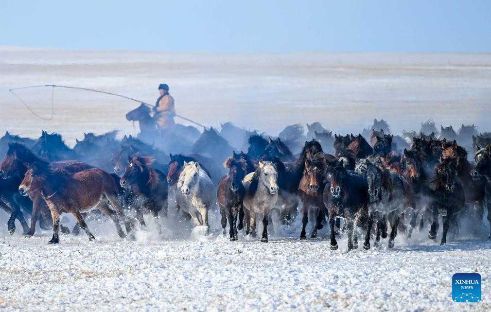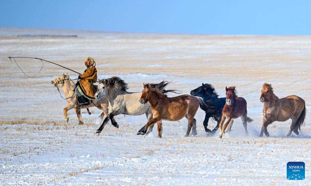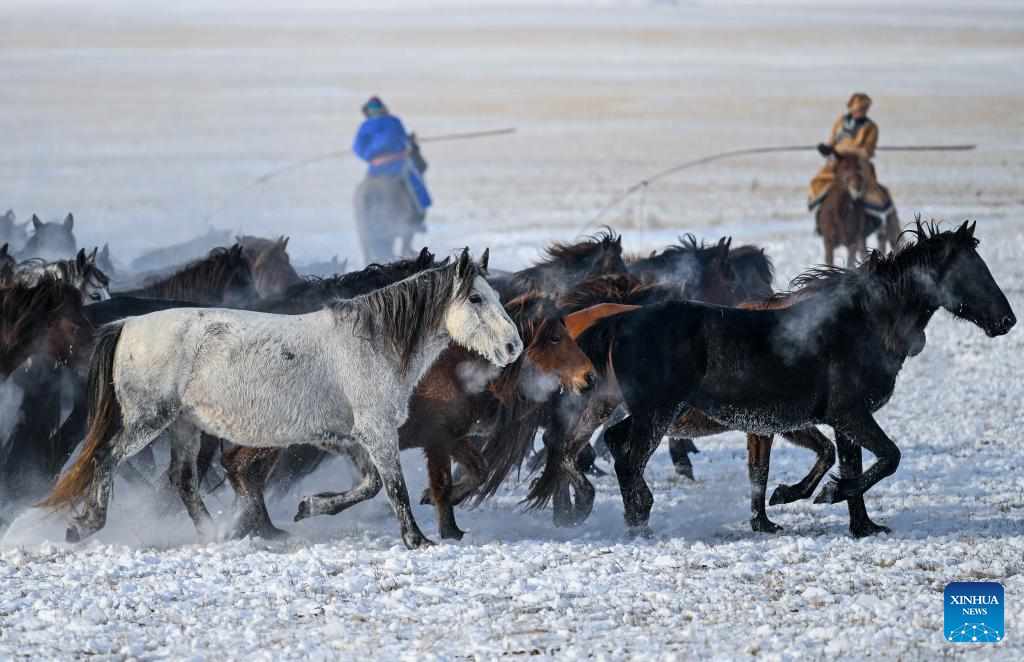 Herdsmen tame horses on a snow-covered grassland in East Ujimqin Banner of Xilingol League, north China's Inner Mongolia Autonomous Region, Dec. 12, 2024. (Xinhua/Peng Yuan)