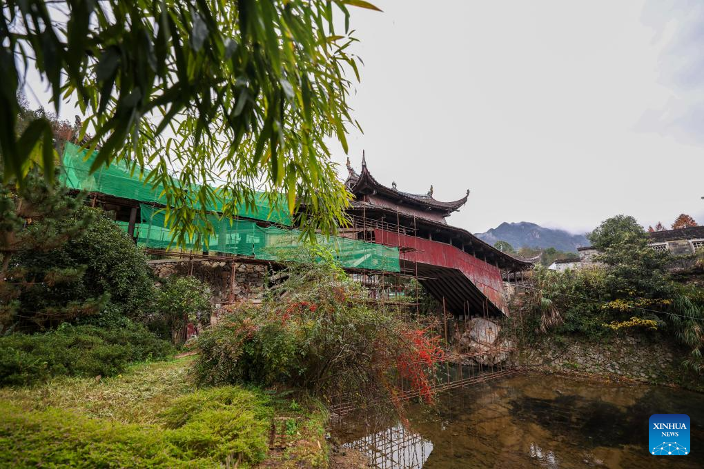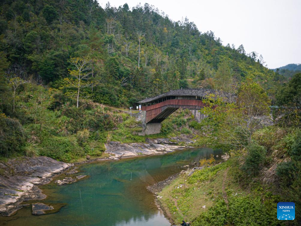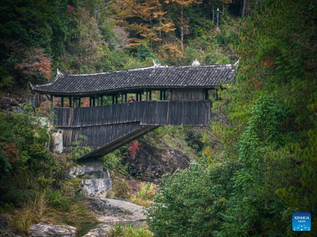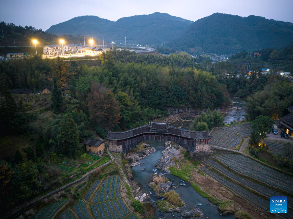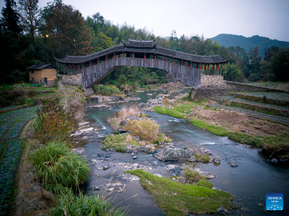 This photo shows a view of Xidong Bridge in Taishun County of Wenzhou City, east China's Zhejiang Province, Dec. 11, 2024. In Taishun County, roofed arch bridges have long served as important pathways facilitating transportation and benefiting locals in areas abound in rivers and mountains. Currently, Taishun is home to over 30 ancient roofed arch bridges including traditional wooden arch bridges. On Dec. 5, UNESCO added traditional design and practices for building Chinese wooden arch bridges to its Representative List of Intangible Cultural Heritage of Humanity. (Xinhua/Jiang Han)