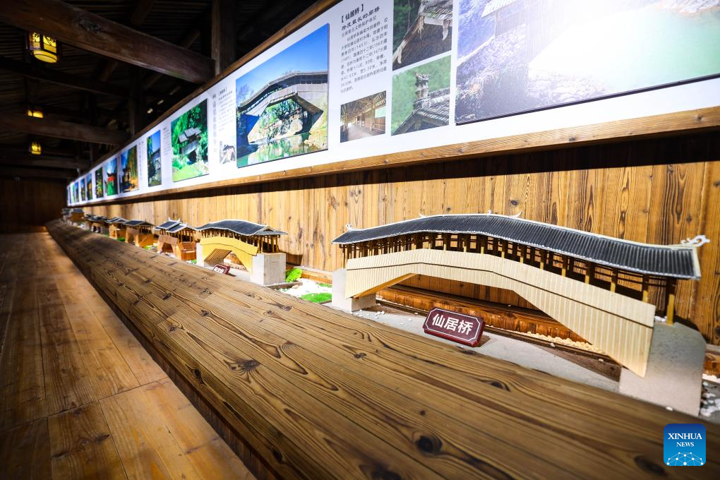 Models of roofed arch bridges are displayed at an exhibition hall in Taishun County of Wenzhou City, east China's Zhejiang Province, Dec. 11, 2024. In Taishun County, roofed arch bridges have long served as important pathways facilitating transportation and benefiting locals in areas abound in rivers and mountains. Currently, Taishun is home to over 30 ancient roofed arch bridges including traditional wooden arch bridges. On Dec. 5, UNESCO added traditional design and practices for building Chinese wooden arch bridges to its Representative List of Intangible Cultural Heritage of Humanity. (Xinhua/Jiang Han)