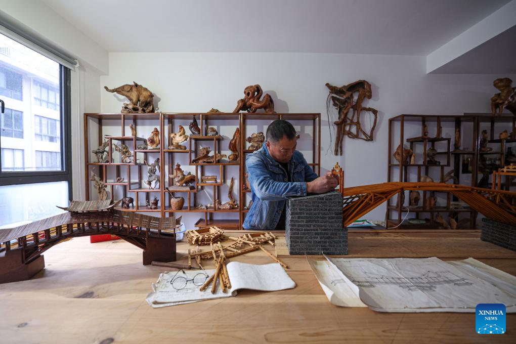 Zeng Jiakuai, a provincial-level inheritor of traditional design and practices for building Chinese wooden arch bridges, makes a bridge model at his studio in Taishun County of Wenzhou City, east China's Zhejiang Province, Dec. 11, 2024. In Taishun County, roofed arch bridges have long served as important pathways facilitating transportation and benefiting locals in areas abound in rivers and mountains. Currently, Taishun is home to over 30 ancient roofed arch bridges including traditional wooden arch bridges. On Dec. 5, UNESCO added traditional design and practices for building Chinese wooden arch bridges to its Representative List of Intangible Cultural Heritage of Humanity. (Xinhua/Jiang Han)