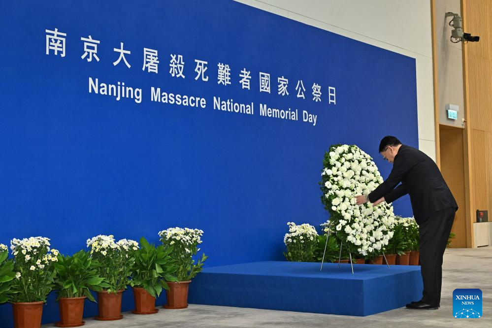 Acting Chief Executive of the Hong Kong Special Administrative Region (HKSAR) Chan Kwok-ki lays a wreath to mourn the victims of the Nanjing Massacre during a commemoration ceremony in south China's Hong Kong, Dec. 13, 2024. China's Hong Kong Special Administrative Region (HKSAR) held a ceremony on Friday to mourn the 300,000 victims of the Nanjing Massacre. (Information Services Department of the Government of the HKSAR/Handout via Xinhua)