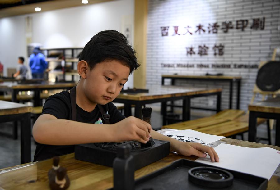 A boy experiences wooden movable-type printing of Xixia characters in Xixia Imperial Tombs scenic area in Yinchuan, northwest China's Ningxia Hui Autonomous Region, Oct. 2, 2019. (Xinhua/Feng Kaihua)