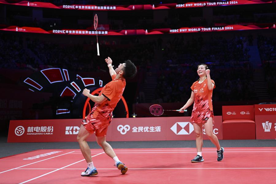 Zheng Siwei (L) and Huang Yaqiong celebrate after winning the mixed doubles final at the 2024 BWF World Tour Finals in Hangzhou, China, Dec. 15, 2024. (Xinhua/Hou Zhaokang)