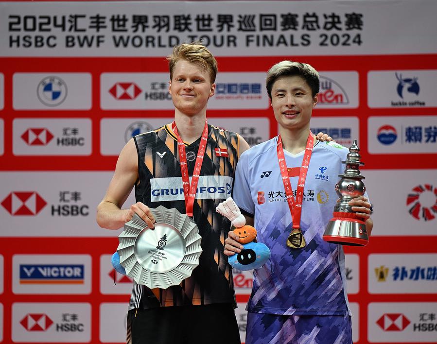 Winner Shi Yuqi (R) of China and runner-up Anders Antonsen of Denmark pose after the men's singles final at the 2024 BWF World Tour Finals. (Xinhua/Hou Zhaokang)