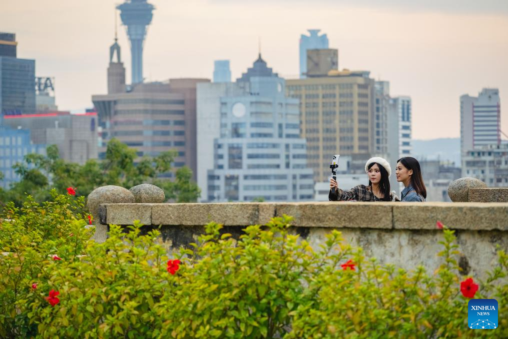 Tourists take selfies at the Monte Fort in south China's Macao, Dec. 12, 2024.