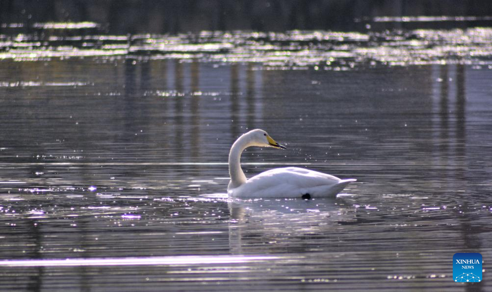 A swan is pictured on the Qingshui River in the upper reaches of Miyun Reservoir in Beijing, capital of China, Nov. 15, 2024. (Xinhua/Li Xin)