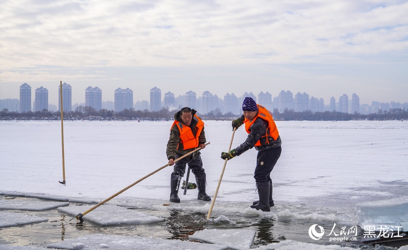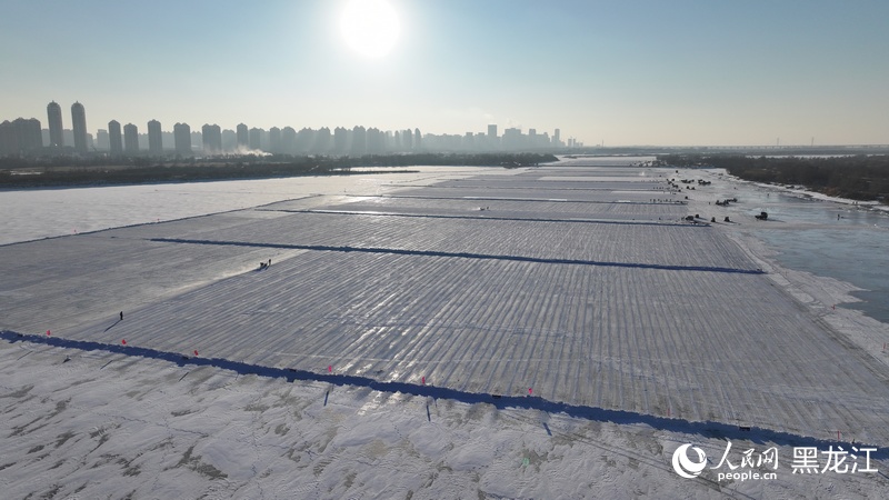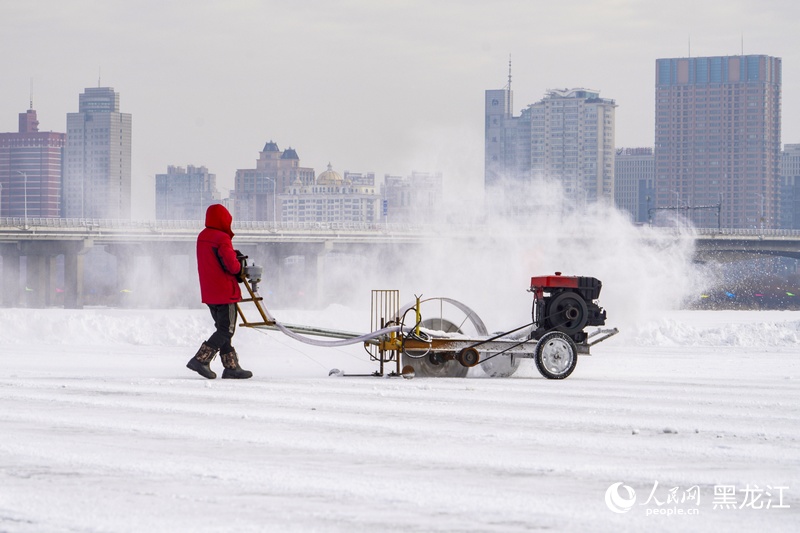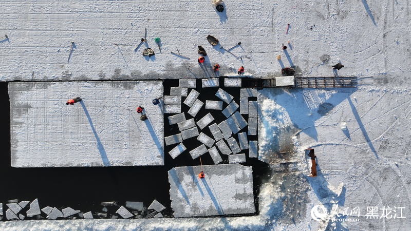 This photo shows how ice is harvested for Harbin Ice and Snow World. (People's Daily Online/Zhang Zhexin, Xu Chenglong)