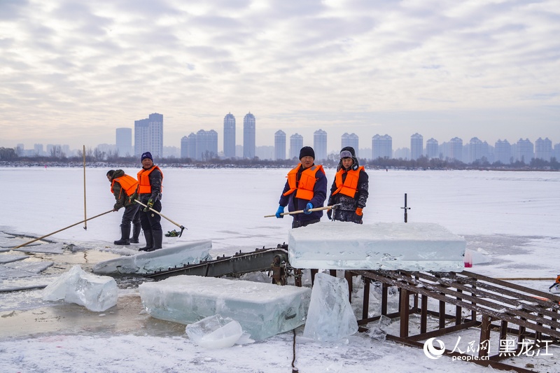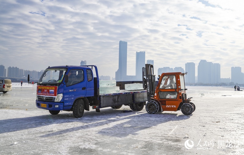 Recently, as the 5th Harbin Ice Harvest Festival kicked off on the north bank of the Songhua River in northeast China's Heilongjiang Province, ice harvesting for the 26th Harbin Ice and Snow World is now in full swing. High-quality ice blocks sourced from the Songhua River are being transported to the Ice and Snow World theme park to build stunning ice landscapes.
