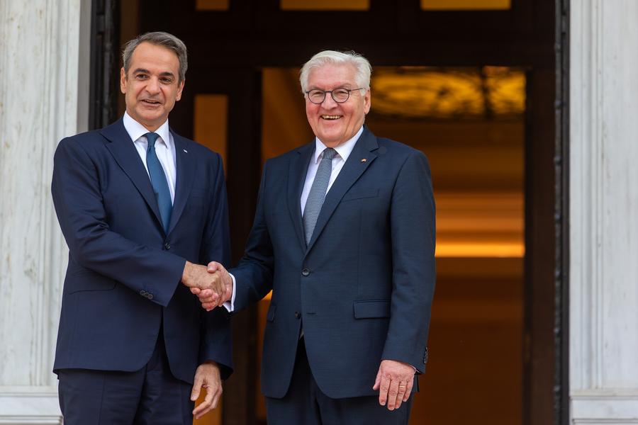 Greek Prime Minister Kyriakos Mitsotakis (L) welcomes German President Frank-Walter Steinmeier in Athens, Greece, on Oct. 30, 2024. (Xinhua/Marios Lolos)