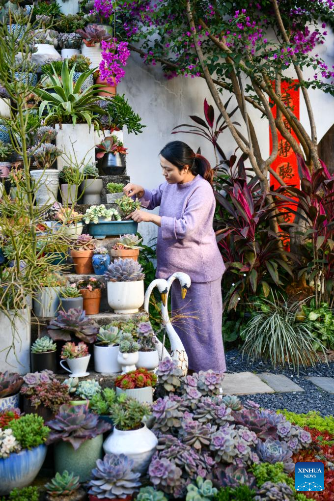 Wan Wei, manager of a studio, takes care of succulents in Shangwei Village, a Hakka village with a history of more than 400 years, in Longhua District of Shenzhen, south China's Guangdong Province, on Dec. 13, 2024. Since 2017, the local government has introduced nearly 100 artistic talents to Shangwei Village to revitalize the ancient village with arts on the basis of originality and cultural creativity.