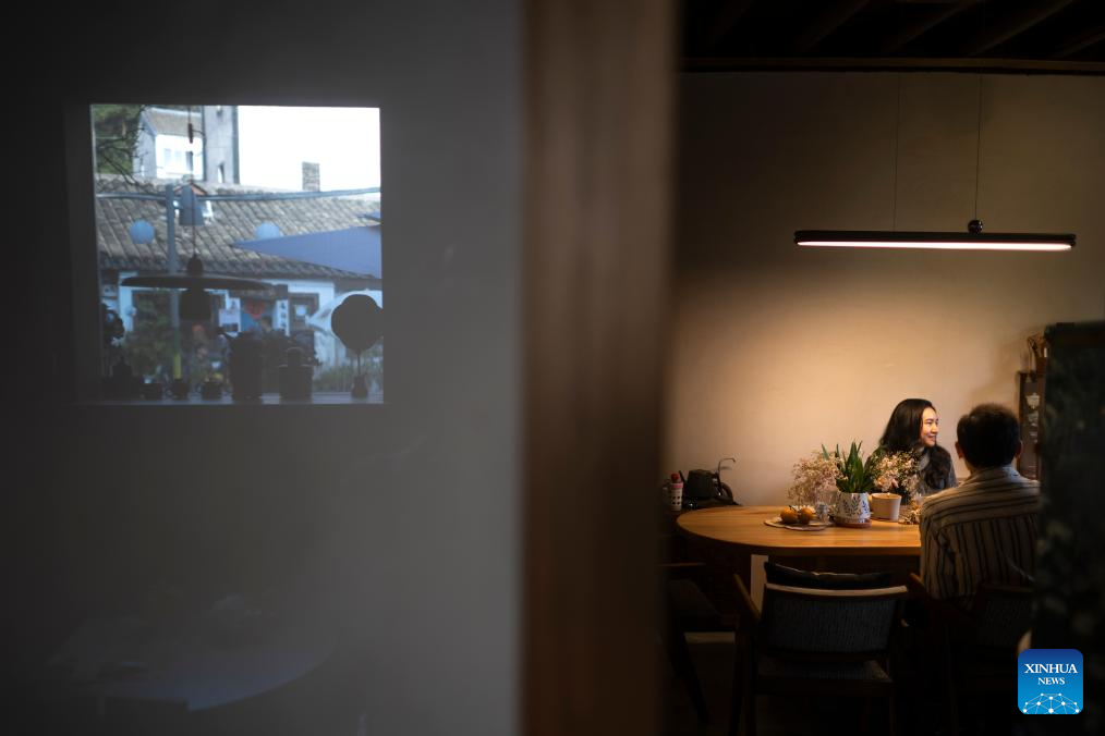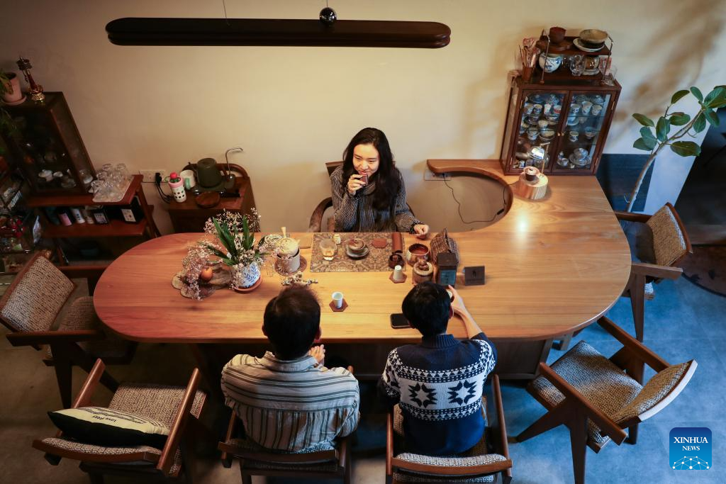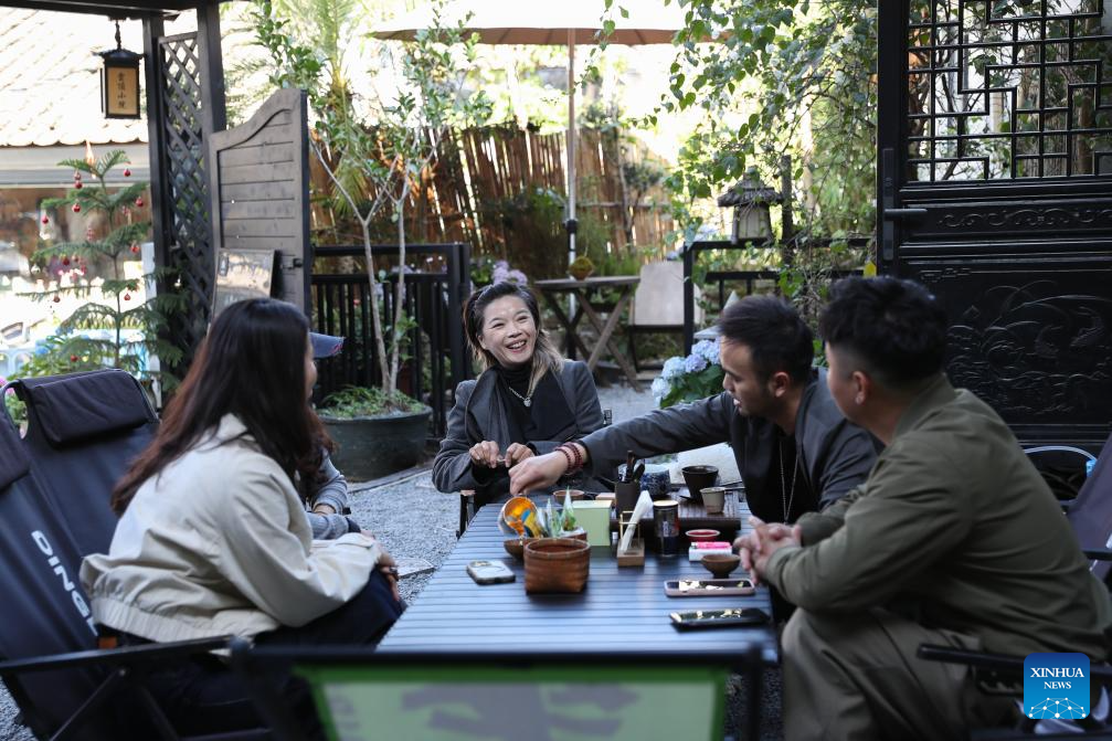 Manager of a tea space Huang Yu (L) makes tea for guests in Shangwei Village, a Hakka village with a history of more than 400 years, in Longhua District of Shenzhen, south China's Guangdong Province, on Dec. 13, 2024. Since 2017, the local government has introduced nearly 100 artistic talents to Shangwei Village to revitalize the ancient village with arts on the basis of originality and cultural creativity.
