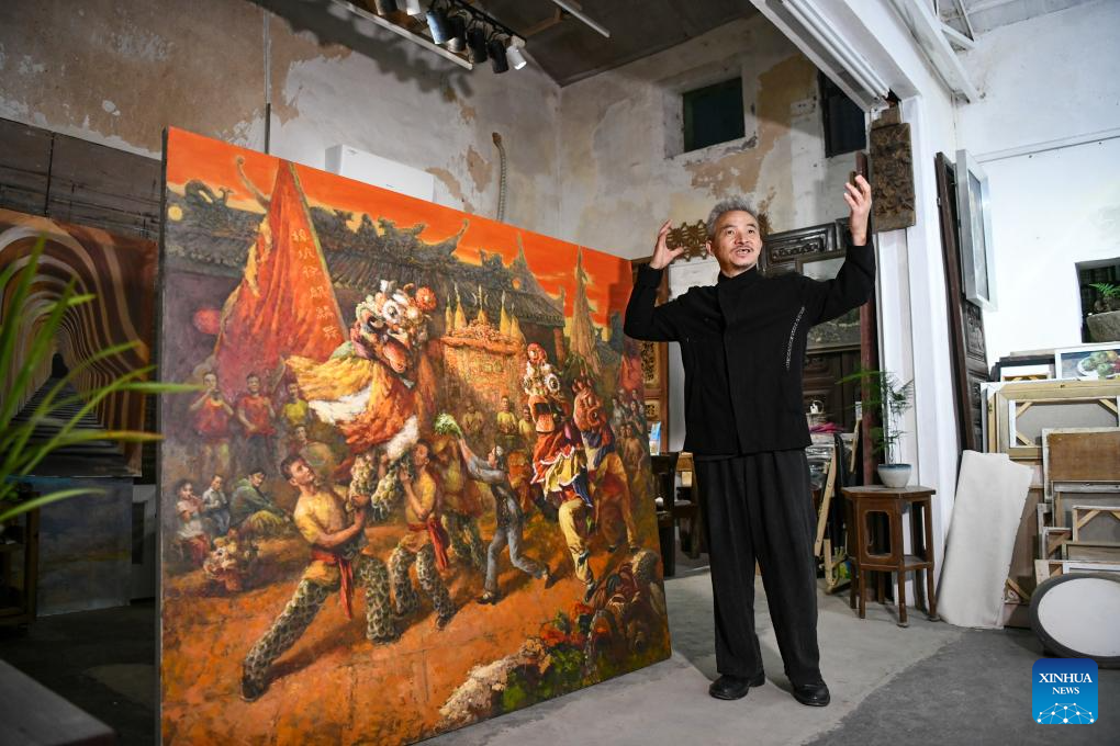 Artist Tang Wenbiao explains an oil painting based on an intangible cultural heritage dance of Guangdong Province at a studio in Shangwei Village, a Hakka village with a history of more than 400 years, in Longhua District of Shenzhen, south China's Guangdong Province, on Dec. 13, 2024. Since 2017, the local government has introduced nearly 100 artistic talents to Shangwei Village to revitalize the ancient village with arts on the basis of originality and cultural creativity.