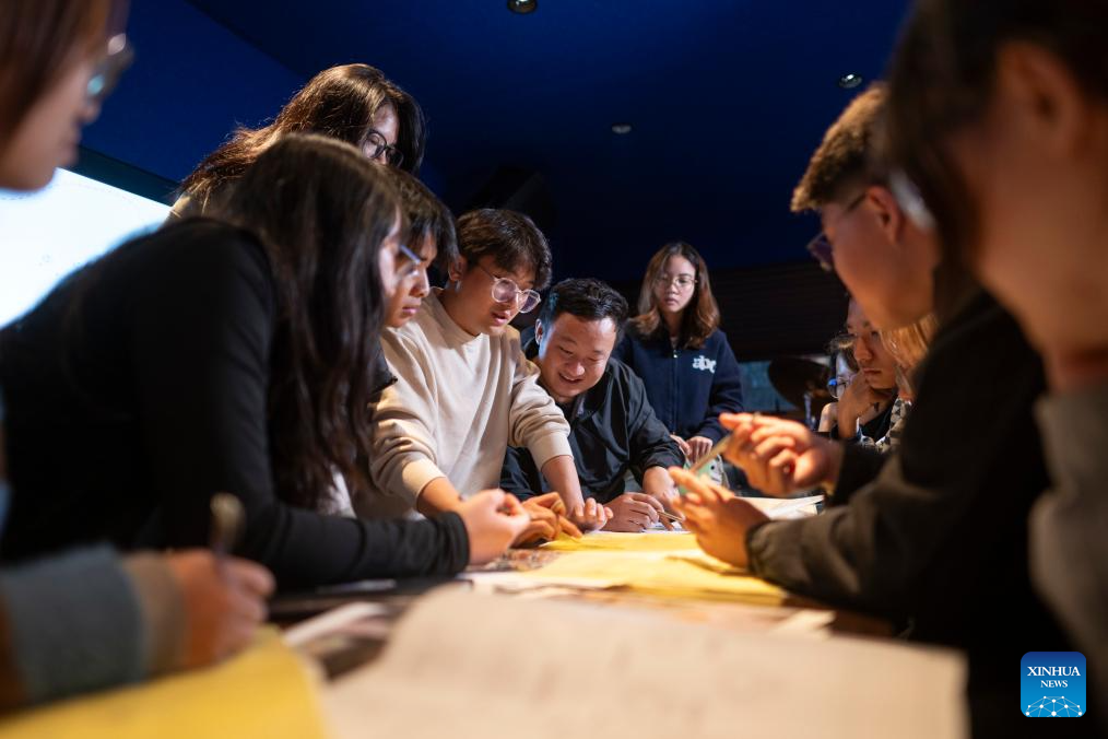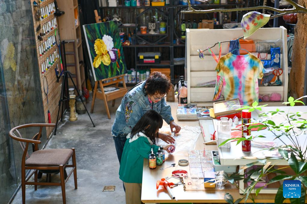 Artist Liu Jingjing guides children to make tie-dye creations at a studio in Shangwei village, a Hakka village with a history of more than 400 years, in Longhua District of Shenzhen, south China's Guangdong Province, on Dec. 13, 2024. Since 2017, the local government has introduced nearly 100 artistic talents to Shangwei Village to revitalize the ancient village with arts on the basis of originality and cultural creativity.