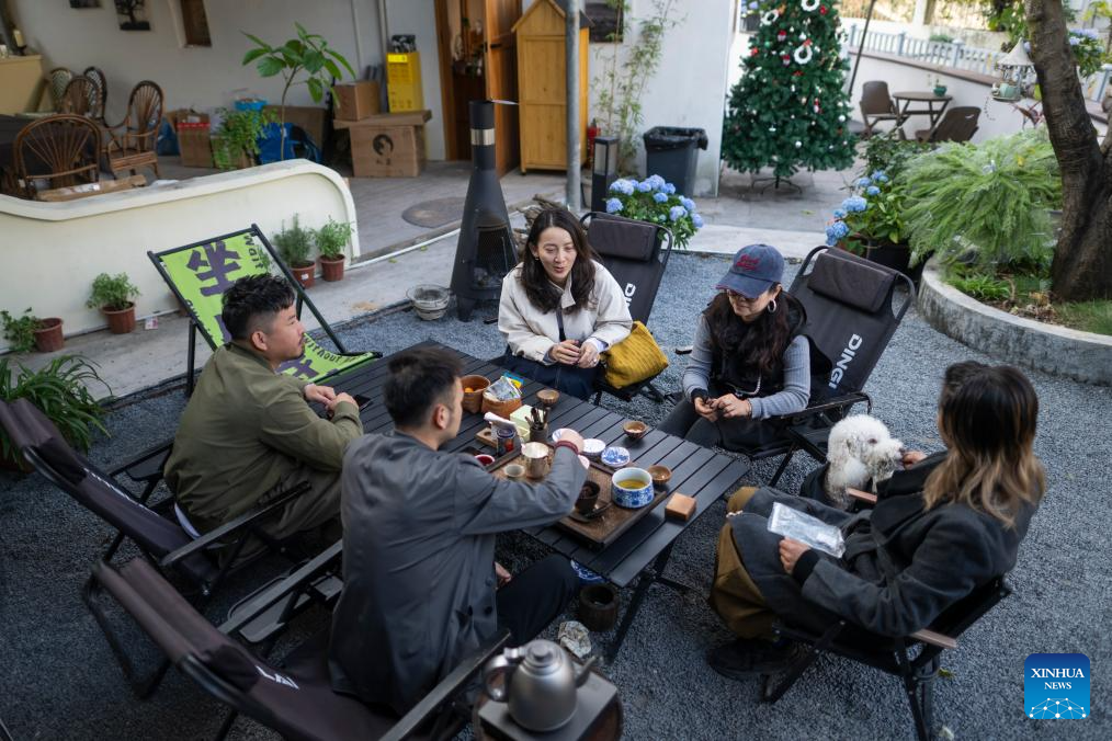 Wang Tao (1st R) and Gao Fei (3rd R), managers of a studio, drink tea with their neighbors in Shangwei Village, a Hakka village with a history of more than 400 years, in Longhua District of Shenzhen, south China's Guangdong Province, on Dec. 13, 2024. Since 2017, the local government has introduced nearly 100 artistic talents to Shangwei Village to revitalize the ancient village with arts on the basis of originality and cultural creativity.